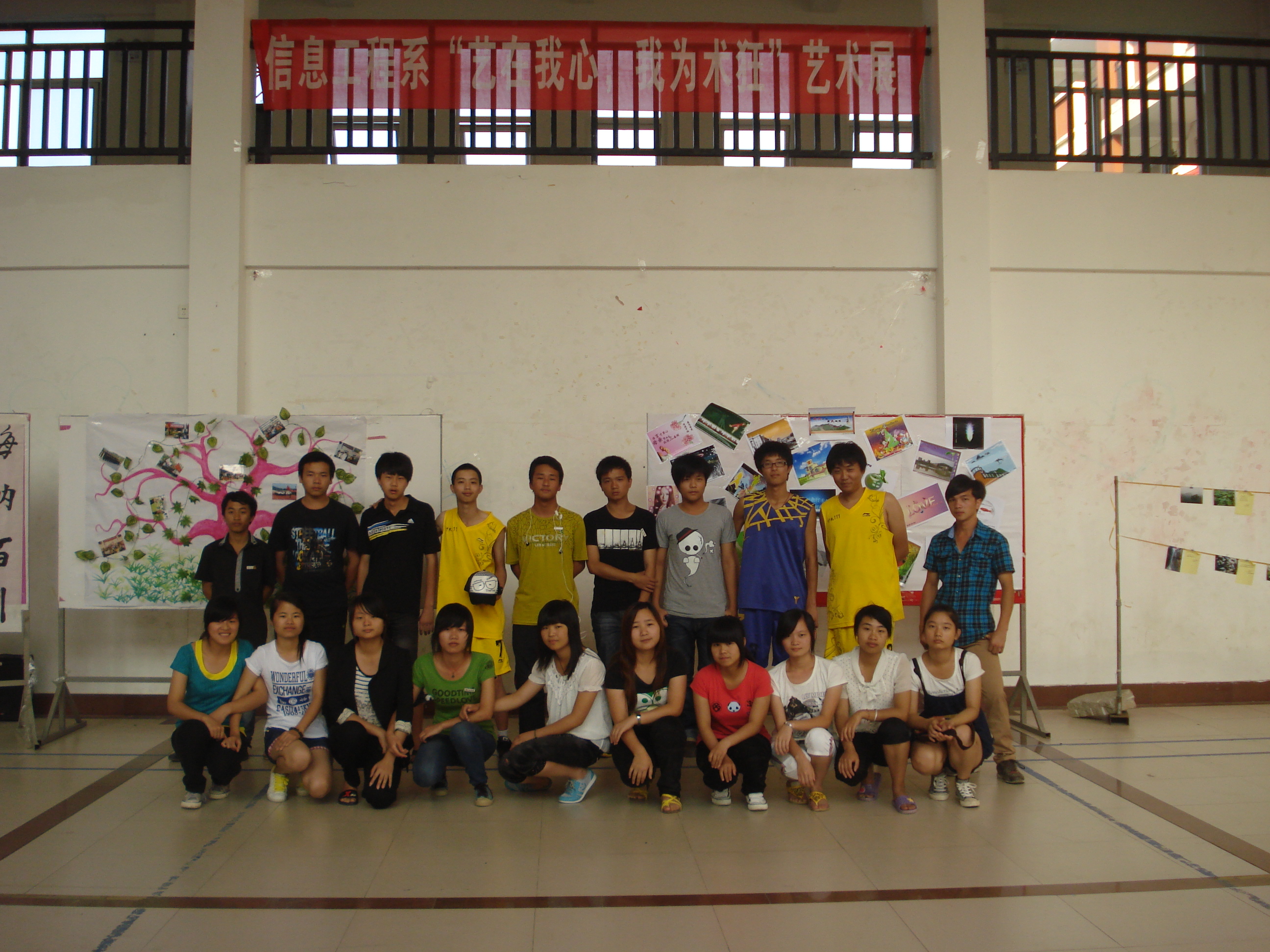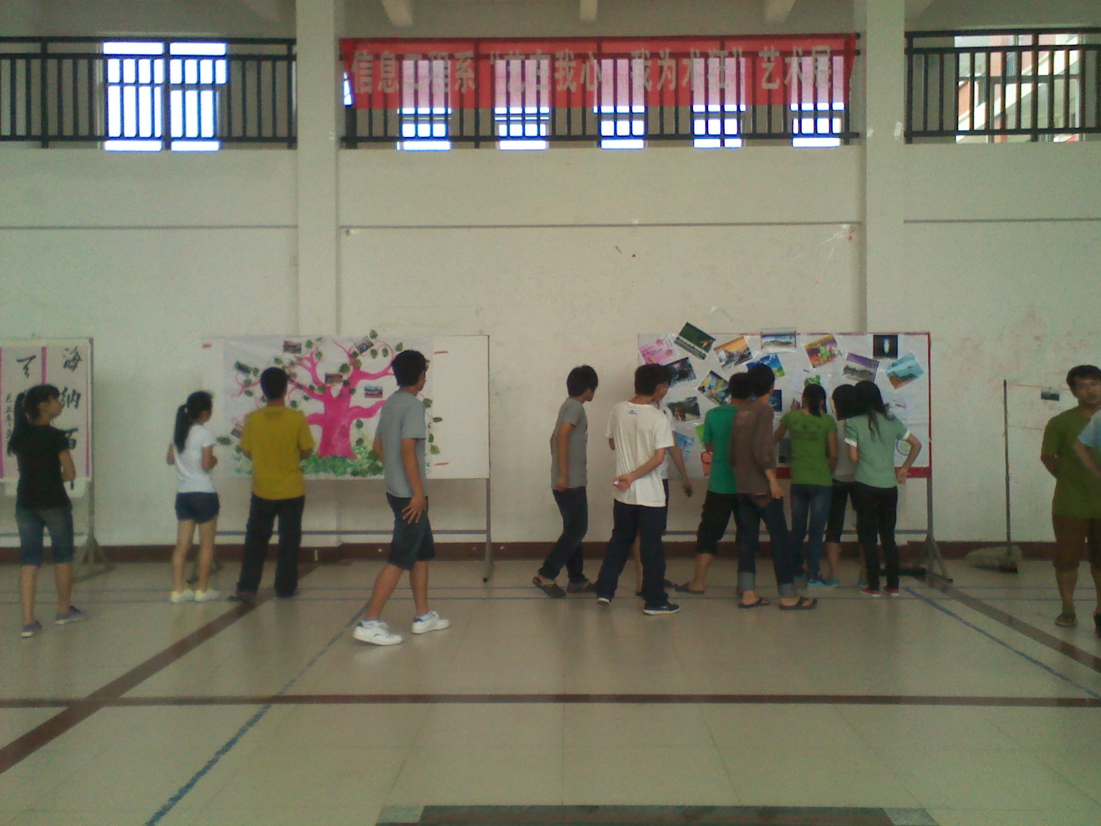 参展的作品主要由信息系学生提供,分为绘画、书法、摄影、手工艺品、还有PS、3D maxs作品共五大类。绘画作品海贼王,人物画的栩栩如生;遒劲的硬笔书法,将中国风骨展现的淋淋尽致;大量的摄影作品,照出了学生们的青春活力;手工作品简单而有创意;PS和3D maxs做出了新世纪信息时代的特点。