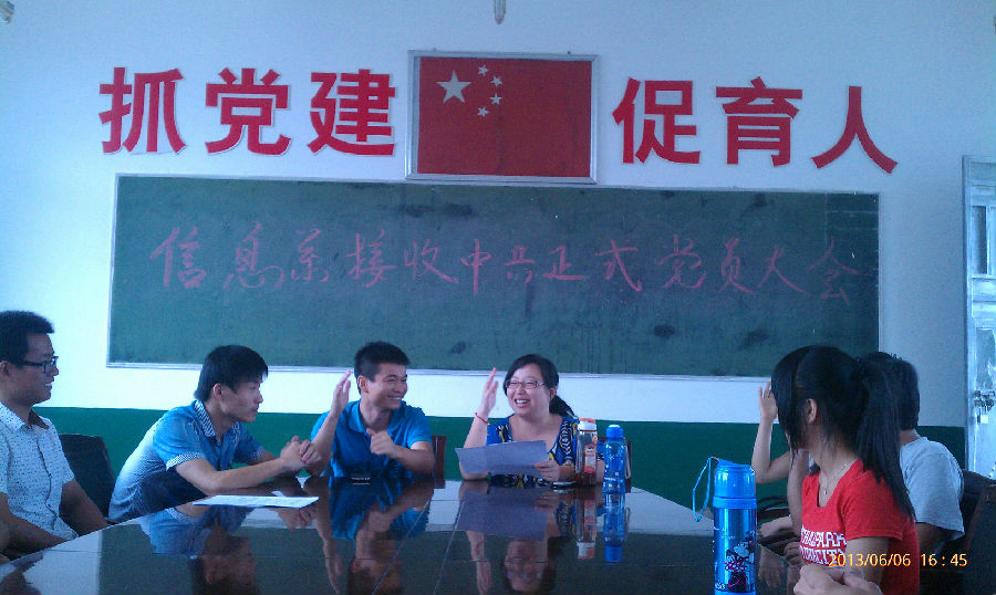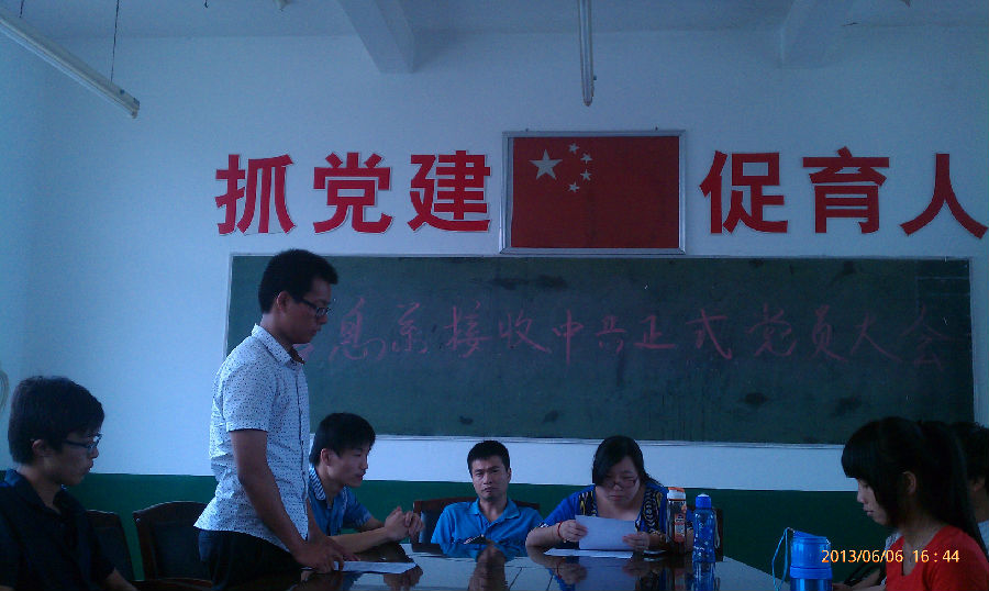 2013年6月6日下午四点半,信息工程系学生党支部在16#401召开接收中共党员大会,出席今天会议的有信息系学生党支部书记郭莹同志、张艳娇等同志以及学生党支部林宇航等多位学生预备党员和被接收李志毅同志,会议由学生党支部书记郭莹郑庆翔同志主持。