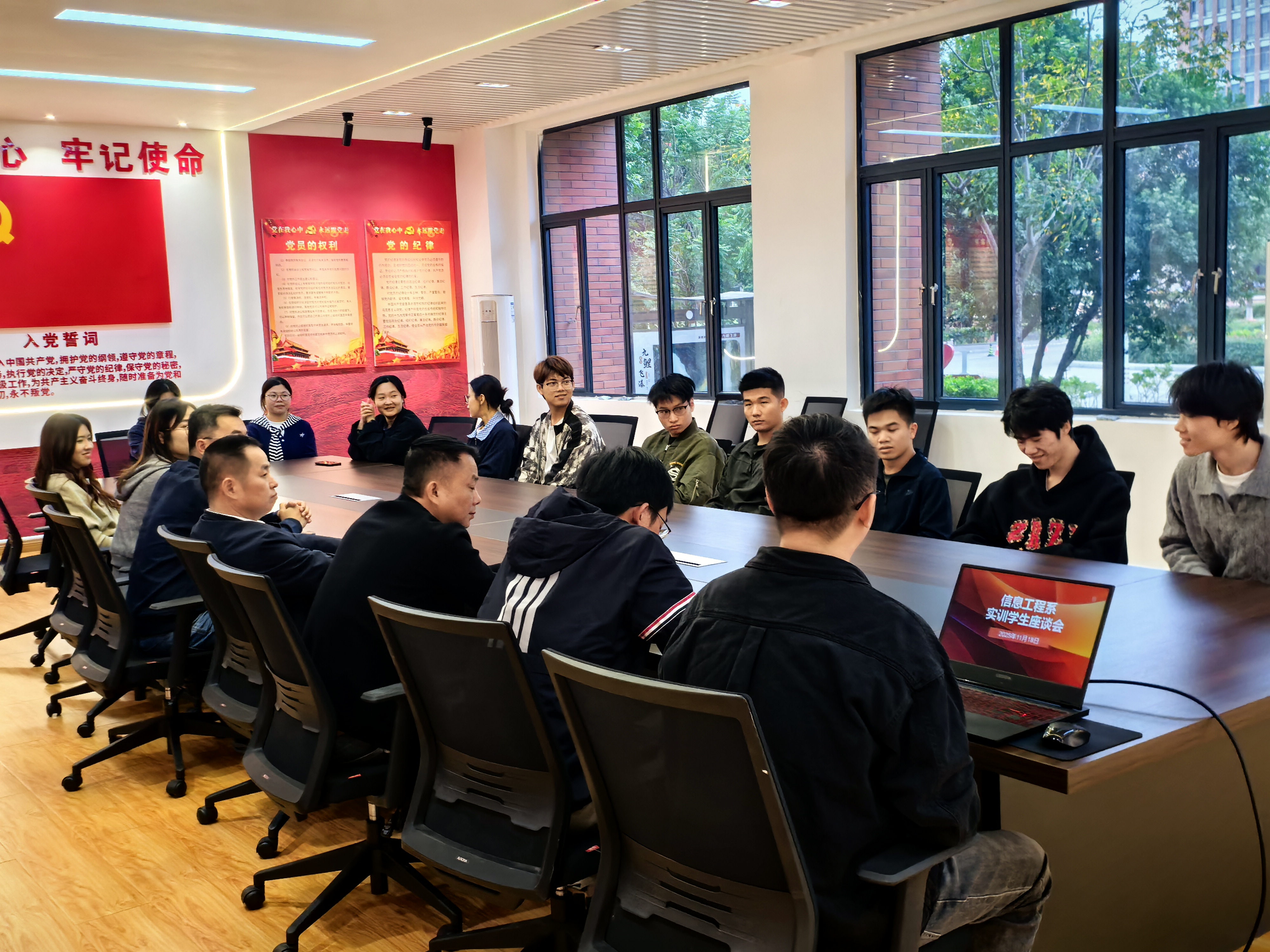 2025年11月18日下午,在仙游校区召开实训学生座谈会,信息工程系党总支书记罗建军、党总支副书记郑健、副主任周向荣、毕业班辅导员以及与20余名学生代表面对面交流,了解学生实训学习与生活情况。