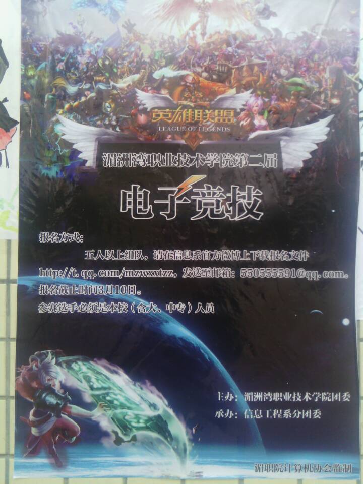 信息工程系举办第二届电子竞技比赛即将开始,本届电子竞技内容现风靡全球最热门的游戏,英雄联盟。你还在苦恼着没有机会一展身手吗?大神们,来吧!带上你的战友一起加入,火速报名,游戏即将开始。报名方式:五人以上组队,请在信息工程系系部网站下载报名,...